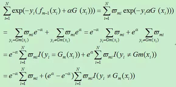 由于am>0,故而exp(-am)<1,当样例被基本分类器正确分类时,其权重在减小,反之权重在增大。