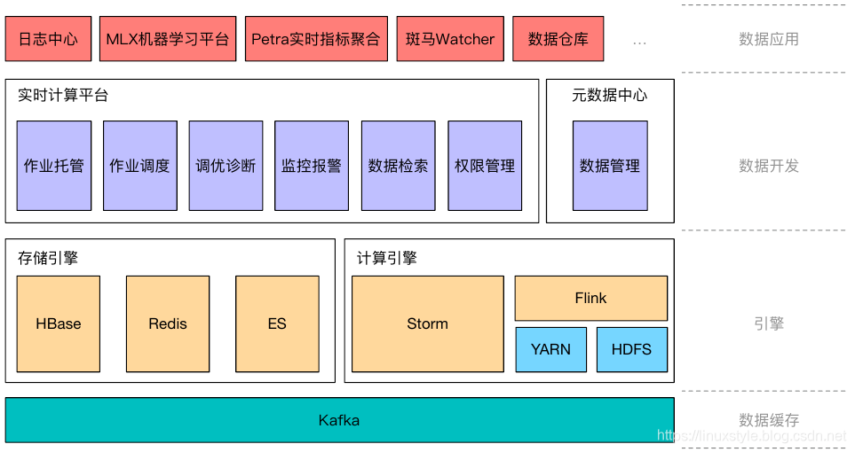 最底层是数据缓存层,可以看到美团测的所有日志类的数据,都是通过统一的日志收集系统收集到Kafka。