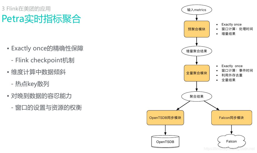 第一个方面是说精确的计算,包括使用了FLink和CheckPoint的机制去保证说我能做到不丢不重的计算,第一个首先是由统一化的Metrics流入到一个预聚合的模块,预聚合的模块主要去做一些初始化的一些聚合,其中的为什么会分预聚合和全量聚合主要的解决一类问题,包括就刚刚那位同学问的一个问题,就是数据倾斜的问题,比如说在热点K发生的时候,当前的解决方案也是通过预聚合的方式去做一些缓冲,让尽量把K去打散,再聚合全量聚合模块去做汇聚。那其实也是只能解决一部分问题,所以后面也考虑说在性能的优化上包括去探索状态存储的性能。