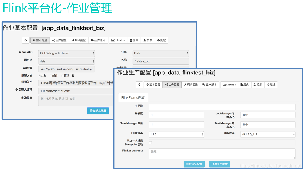 在实践过程中,为了解决作业管理的一些问题,减少用户开发的一些成本,我们做了一些平台化的工作,下图是一个作业提交的界面展示,包括作业的配置,作业生命周期的管理,报警的一些配置,延迟的展示,都是集成在实时计算平台的。