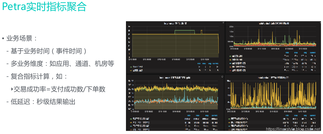 第一个是Petra,Petra其实是一个实时指标的一个聚合的系统,它其实是面向公司的一个统一化的解决方案。它主要面向的业务场景就是基于业务的时间去统计,还有计算一些实时的指标,要求的话是低时延,他还有一个就是说,因为它是面向的是通用的业务,由于业务可能是各自会有各自不同的维度,每一个业务可能包含了包括应用,通道,机房,还有其他的各自应用各个业务特有的一些维度,而且这些维度可能涉及到比较多,另外一个就是说它可能是就是业务需要去做一些复合的指标的计算,比如说最常见的交易成功率,他可能需要去计算支付的成功数,还有和下单数的比例。