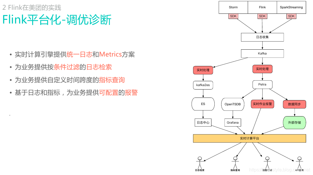 另外就是刚刚提到说在开发实时作业的时候,调优和诊断是一个比较难的痛点,就是用户不是很难去查看分布式的日志,所以也提供了一套统一的解决方案。这套解决方案主要是针对日志和Metrics,会在针对引擎那一层做一些日志和Metrics的上报,那么它会通过统一的日志收集系统,将这些原始的日志,还有Metrics汇集到Kafka那一层。今后Kafka这一层大家可以发现它有两个下游,