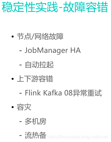 Flink不同的是他对异常的容忍度是非常的苛刻的,那时候就考虑的是比如说会发生节点或者是网络的故障,那JobManager单点问题可能就是一个瓶颈,JobManager那个如果挂掉的话,那么可能对整个作业的影响就是不可回复的,所以考虑了做HA,另外一个就是会去考虑一些由于运维的因素而导致的,还有除此之外,可能有一些用户作业是没有开启CheckPoint,但如果是因为节点或者是网络故障导致挂掉,希望会在平台那一层做一些自动拉起的策略,去保证作业运行的稳定性。