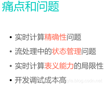 实时计算表义能力的局限性:在实时计算之前很多公司大部分的数据开发还是面向离线的场景,近几年实时的场景也慢慢火热起来了。那与离线的处理不同的是,实时的场景下,数据处理的表意能力可能有一定的限制,比如说他要进行精确计算以及时间窗口都是需要在此之上去开发很多功能性的东西。