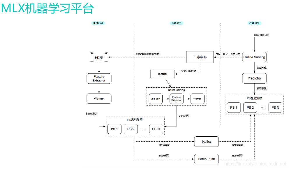 另一个就是近线模式,近线模式出的数据就是现有的从日志收集系统流转过来的统一的日志,经过Flink的处理,就是包括流的关联以及特征的提取,再做模型训练,流转到最终训练集群,训练集群会产出P的特征,还有都是Delta的特征,最终将这些特征影响到线上的线上的特征的一个训练的一个服务上。