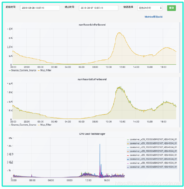 下图是当前某一个作业的一个可支持跨天维度的Metrics的一个查询的页面。可以看到说如果是能够通过纵向的对比,可以发现除了作业在某一个时间点是因为什么情况导致的?比如说延迟啊这样容易帮用户判断一些他的做作业的一些问题。除了作业的运行状态之外,也会先就是采集一些节点的基本信息作为横向的对比