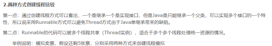 这个说法是举一个火车票售票的例子,大致意思是说实现Runnable接口可以实现多继承,这一点说的是正确的,但是错误的是下面的,那些例子会说实现Runnable接口的多线程可以实现共享,而继承Thread类的线程是不会共享的。其实之所以造成他们的说法看起来对是刻意在继承Thread类的时候故意新建几个线程,而成员变量又不是静态的自然是不能共享的。