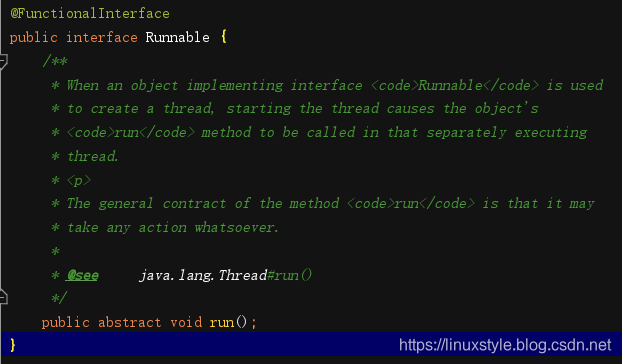 可以看到 Runnable接口就一个run方法,然后Thread类实现了这个run方法,同时自己又实现了很多其他方法。