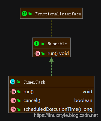 从类图可以看出TimerTask实现了Runnable接口的run()方法。