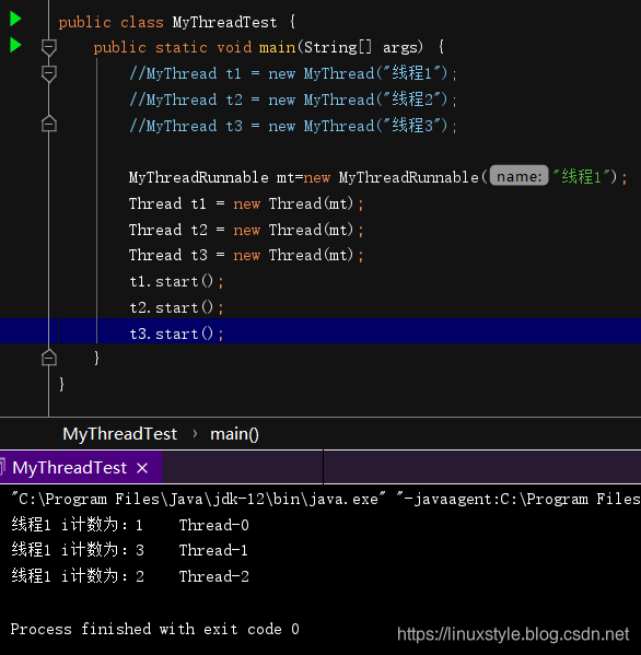 MyThreadRunnable mt1=new MyThreadRunnable("线程1");