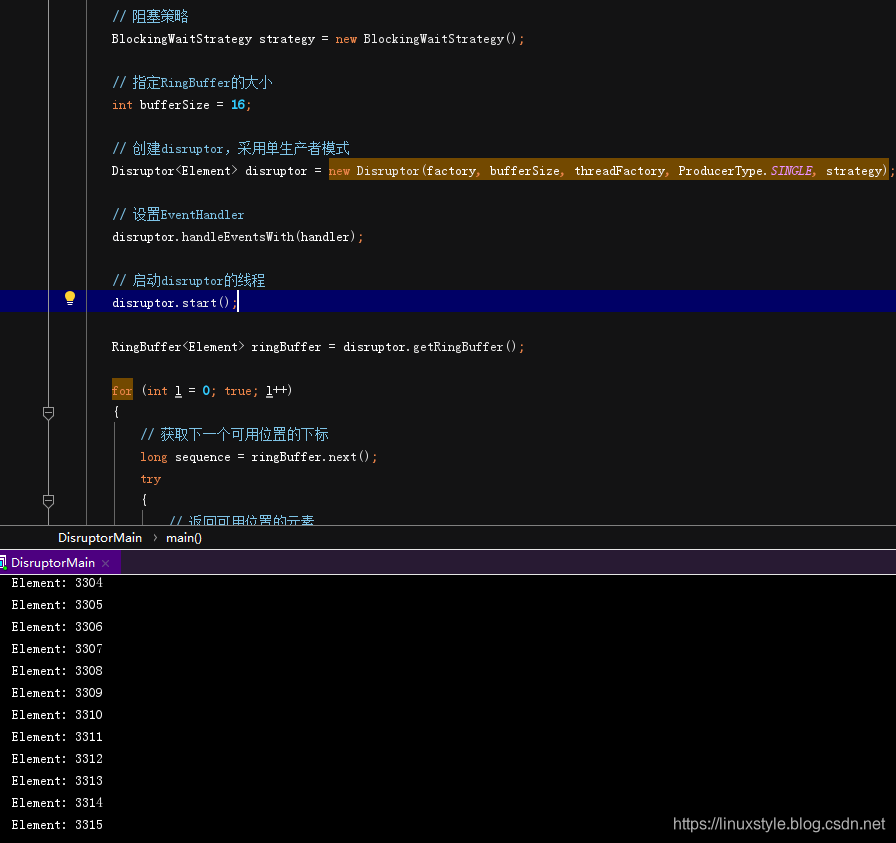 Disruptor<Element> disruptor = new Disruptor(factory, bufferSize, threadFactory, ProducerType.SINGLE, strategy);