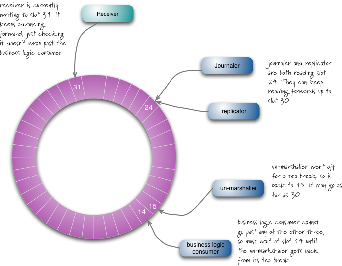每个生产者和消费者都有一个序列计数器,用于指示它当前正在处理的缓冲区中的哪个槽。每个生产者/消费者编写自己的序列计数器,但可以读取其他序列计数器。通过这种方式,生产者可以读取消费者的计数器,以确保可以在没有计数器锁定的情况下使用它想要写入的插槽。类似地,消费者可以确保它只通过观察计数器一旦另一个消费者完成消息就处理消息。