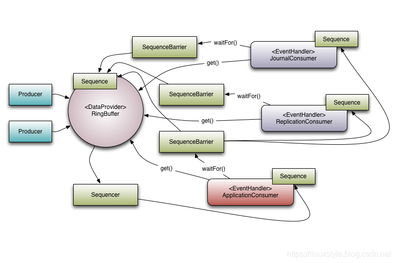 - Sequence Barrier序列屏障:序列屏障由序列发生器产生,包含对序列发生器中主要发布的序列和任何依赖性消费者的序列的引用。它包含确定是否有任何可供消费者处理的事件的逻辑。