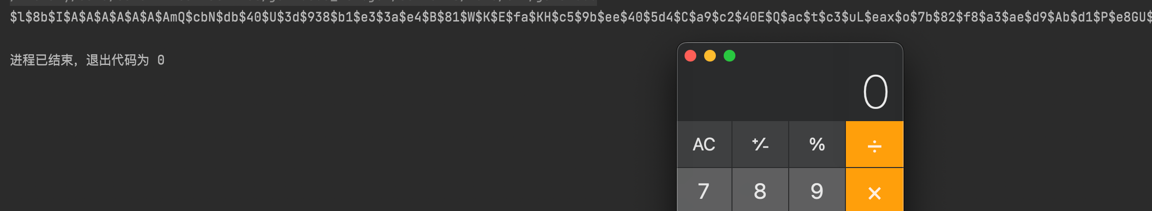可以看到我们控制台上不仅出现了一段看不懂的加密字符,还弹出了计算器,说明我们的恶意代码被执行了。