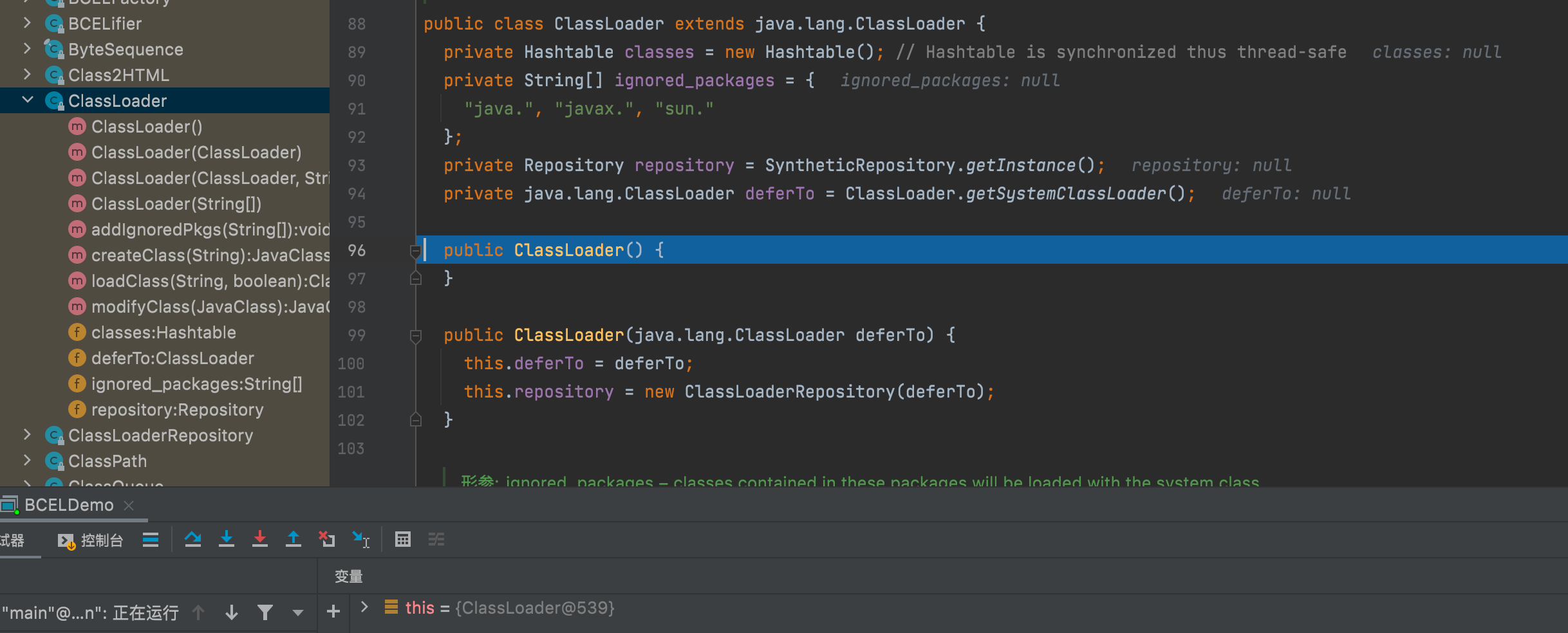 - 我们在弹出计算器的这段代码打上断点,f7步入ClassLoader,创建完毕一个ClassLoader对象