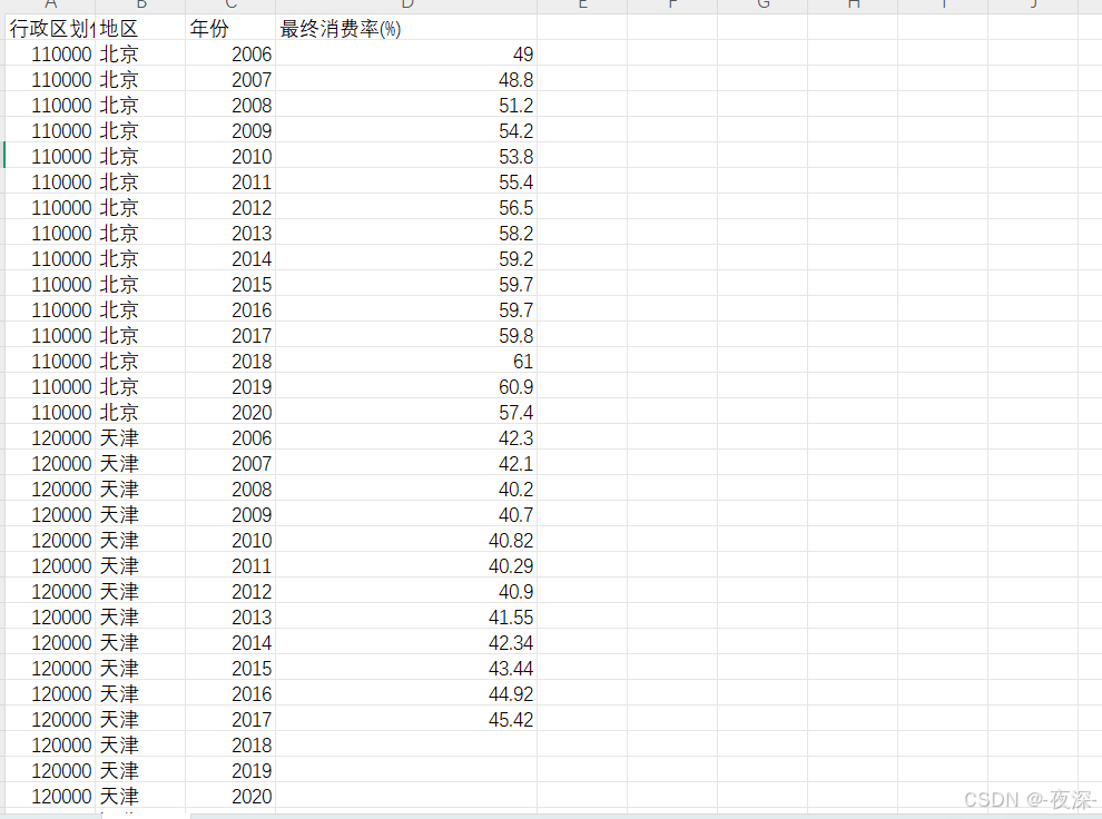 3、指标:行政区划代码、地区、年份、最终消费率(%)