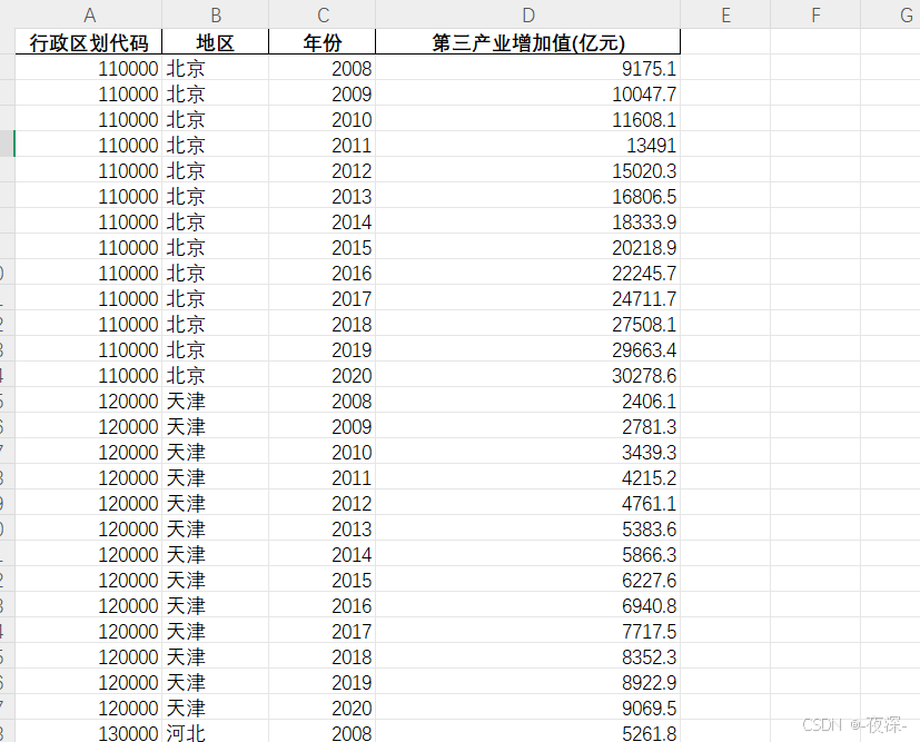 3、指标:行政区划代码、地区、年份、第三产业增加值