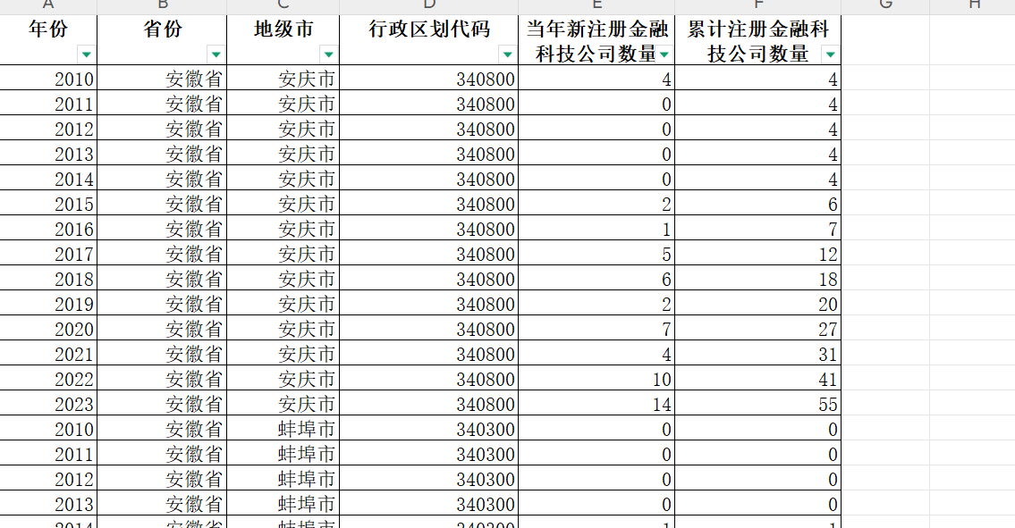 3.指标:年份、省份、地级市、行政区划代码、当年新注册金融科技公司数量、累计注册金融科技公司数量