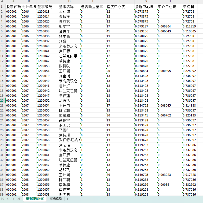 3、指标:股票代码、会计年度、董事编码、董事名称、是否独立董事、程度中心度、接近中心度、中介中心度、结构洞