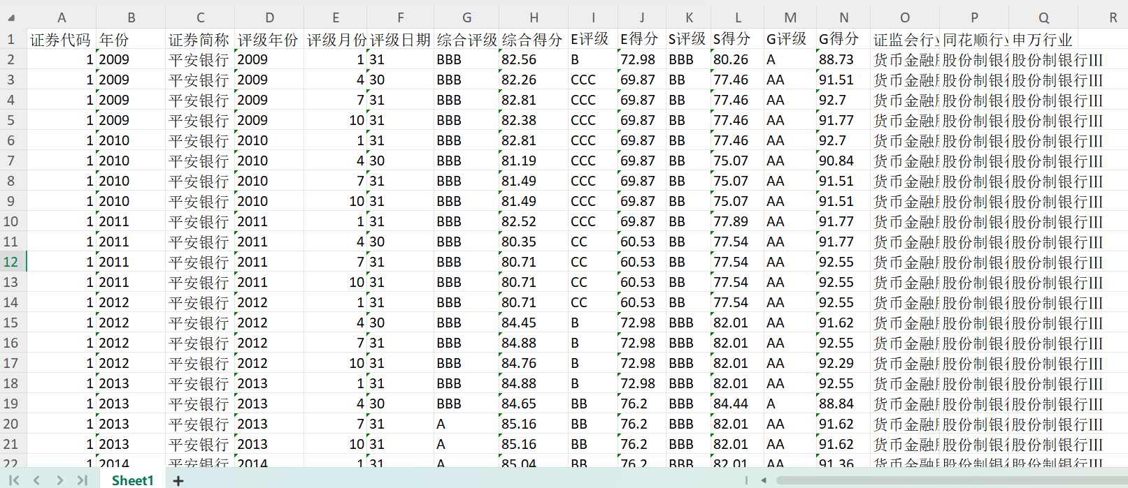 3、指标:证券代码、年份、证券简称、评级年份、评级月份、评级日期、综合评级、综合得分、E评级、E得分、S评级、S得分、G评级、G得分、证监会行业新、同花顺行业新、申万行业