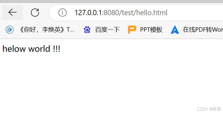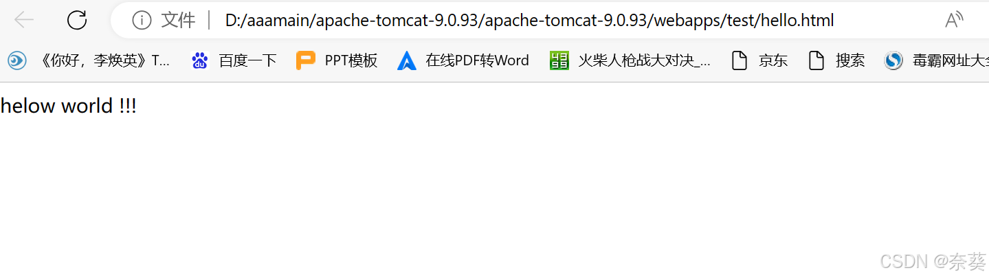 在webapps新建文件test,在test文件里创建hello.html文件,使用vscode编写内容,重新启动tomcat,浏览器输入127.0.0.1:8080/test/hello.html就可以打开该网页