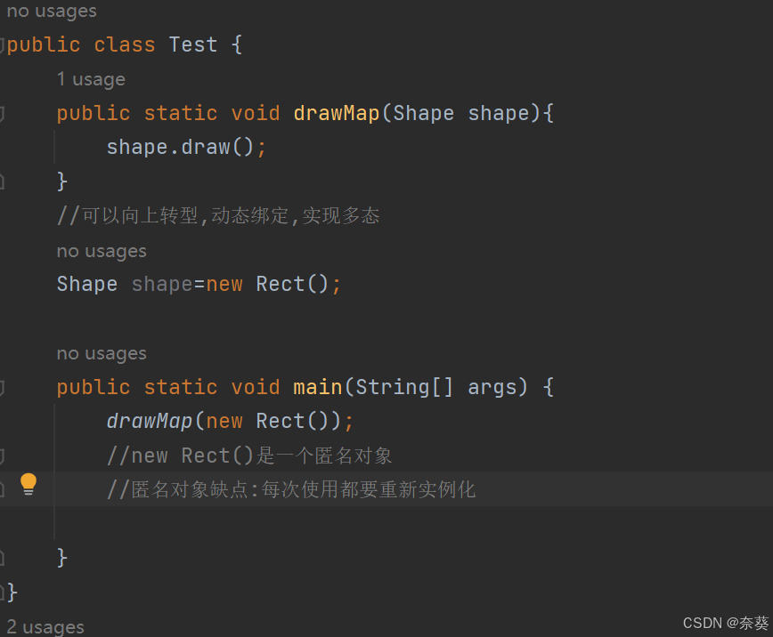 如果一个类中没有包含足够的信息来描述一个具体的对象,这样的类就是抽象类,没有实际工作的方法为抽象方法;例如Animal类 不代表某个具体的动物
