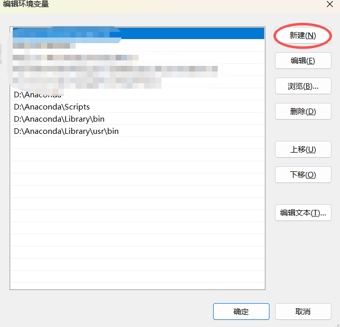 - 点击新建,将以下几个变量编辑进去,我的安装路径:D/anaconda;关于第四个文件目录,没有的需要自己配置一下,以免在后续使用中碰到不必要的错误;