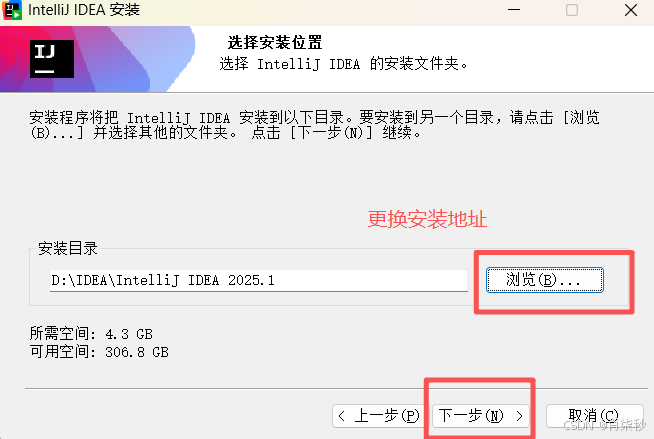 - 更换软件安装地址,建议安装在除C盘以外的磁盘,新建一个文件夹,安装IDEA,点击下一步