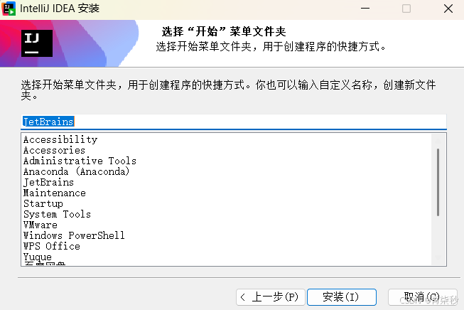 - 在开始文件夹中创建快捷方式选择“JetBrains”,这里默认不变,点击安装