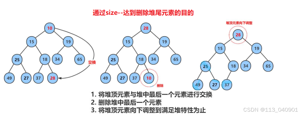 注意:堆的删除一定删除的是堆顶元素。具体如下: