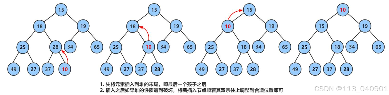 - 将最后新插入的节点向上调整,直到满足堆的性质