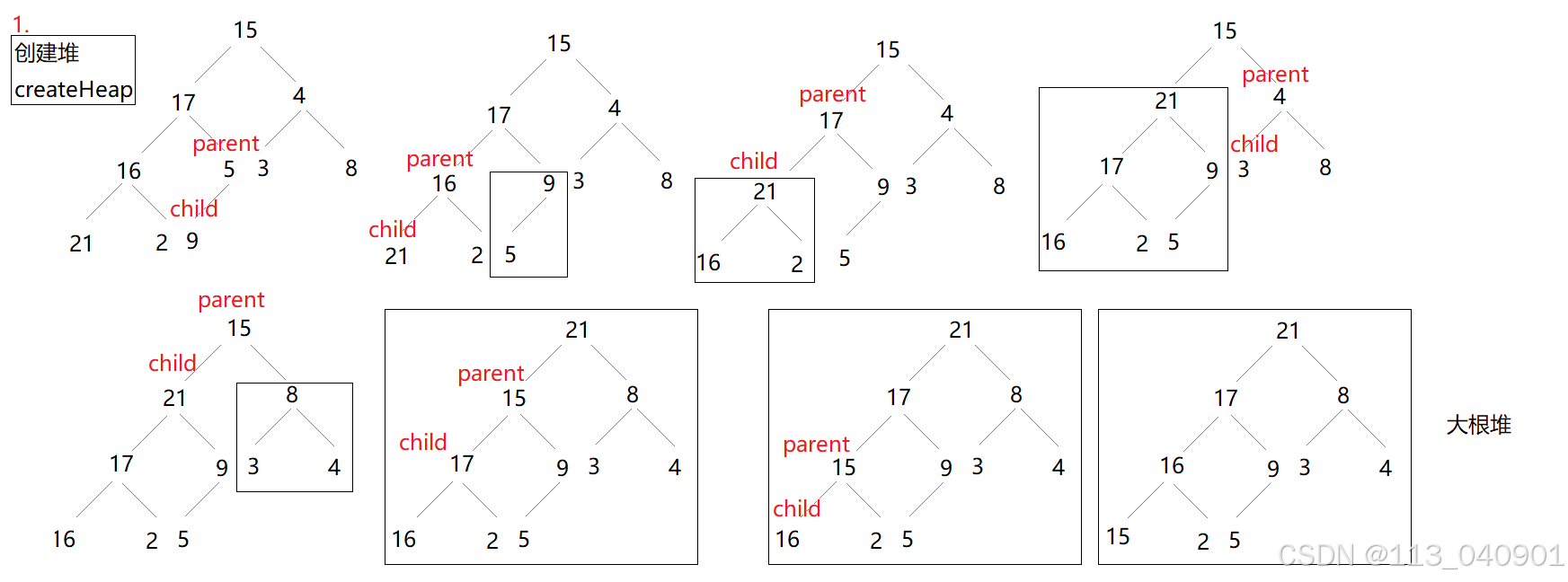 以大根堆为例,大根堆需要确保,每一棵子树都是大根堆,所以采用向下调整,从最后一个parent节点开始,每调整完后parent--,直到parent=0结束。