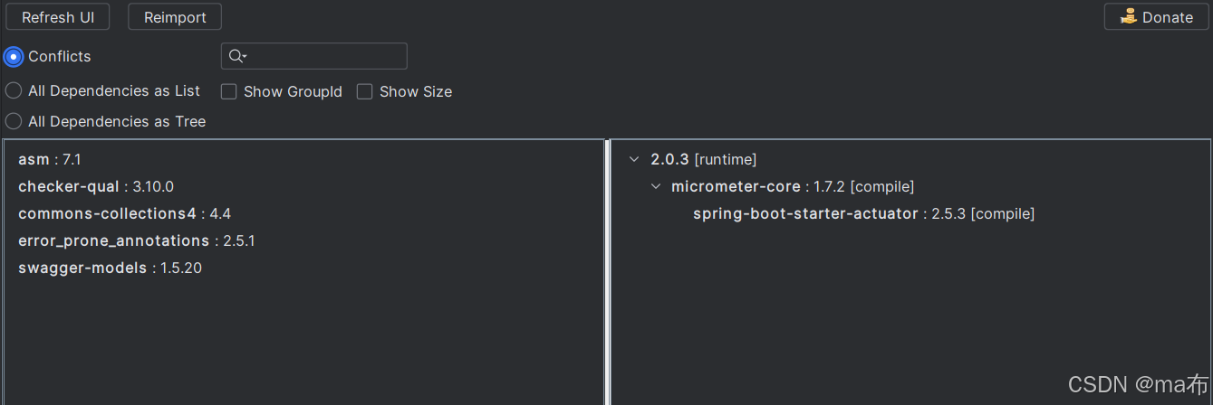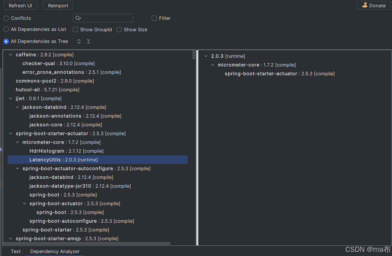 进入Dependency Analyzer视图之后有三个查看选项,分别是Conflicts(冲突)、All Dependencies as List(列表形式查看所有依赖)、All Dependencies as Tree(树结构查看所有依赖)。并且这个页面还支持搜索。如下: