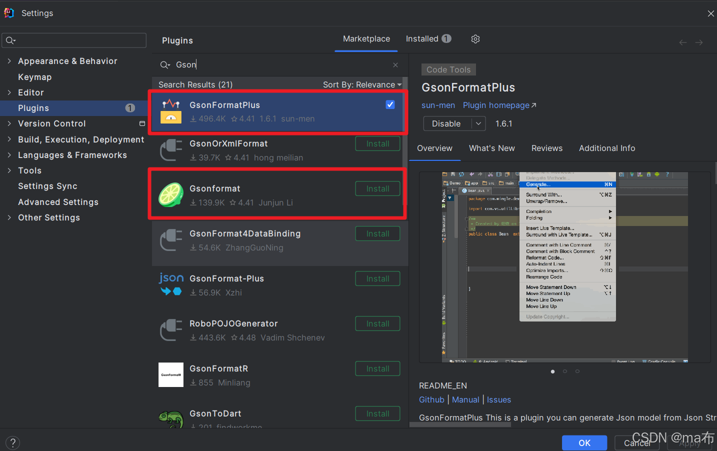 Java开发中,经常有把json格式的内容转成Object的需求,比如项目开始时,合作方给你提供了一个json格式request/response,这时候你就需要将其定义成一个Java类,GsonFormat这款插件可以实现该功能。
