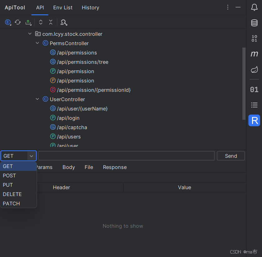 安装好后,重启项目,便可以看到右边有一个R类型的标识,可以根据自己写的接口进行一个简单的测试调用,并且是根据RestfulAPI规范去实现的