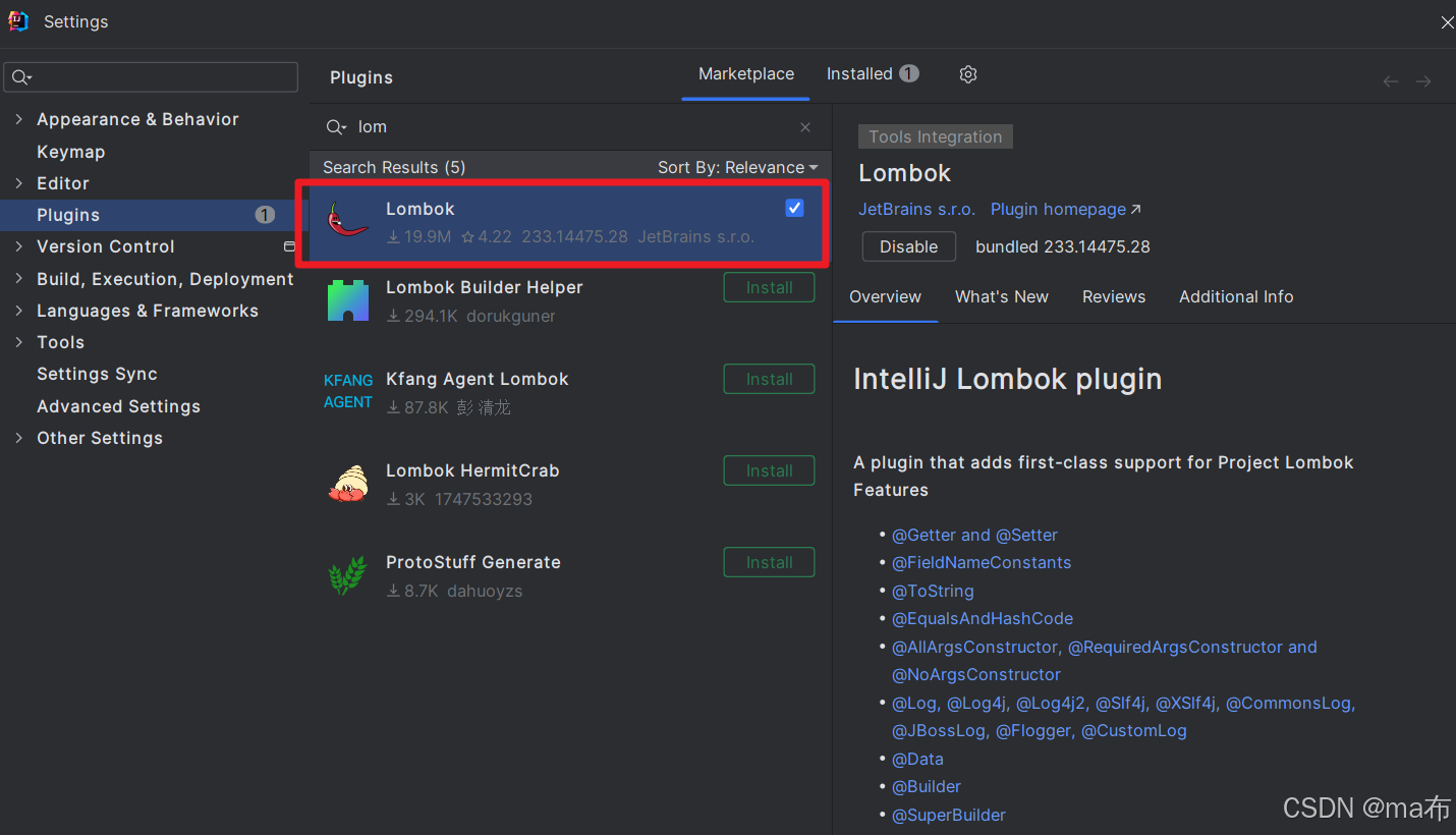 只要在IDEA中安装了该插件,只需要在JavaBean中添加一行注解代码,插件就会自动帮我们生成getter、setter、toString、equals和hashCode等方法。