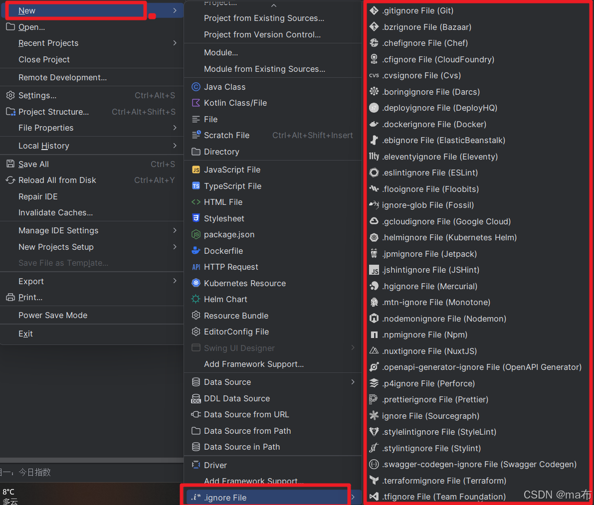 安装插件后,选中项目,右键新建的时候,会多出一个.ignore文件的选项,可以通过这个选项创建ignore文件。