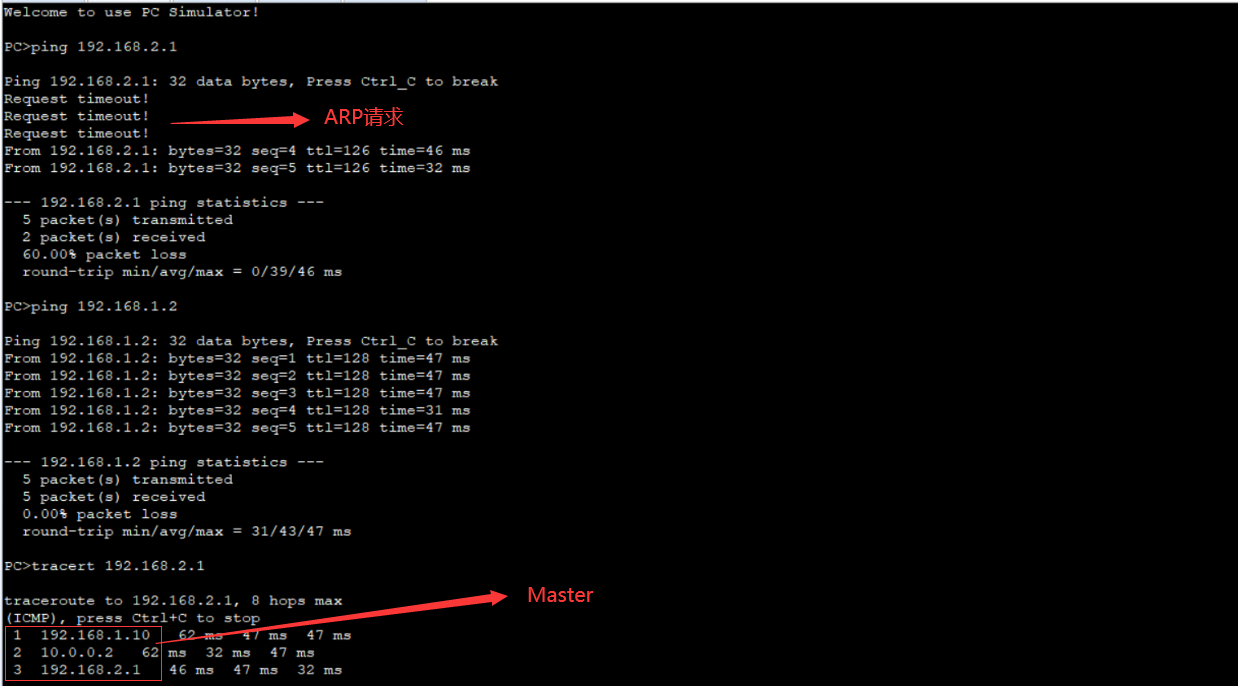 用PC2 ping PC3,再用PC2 ping PC1并追踪
