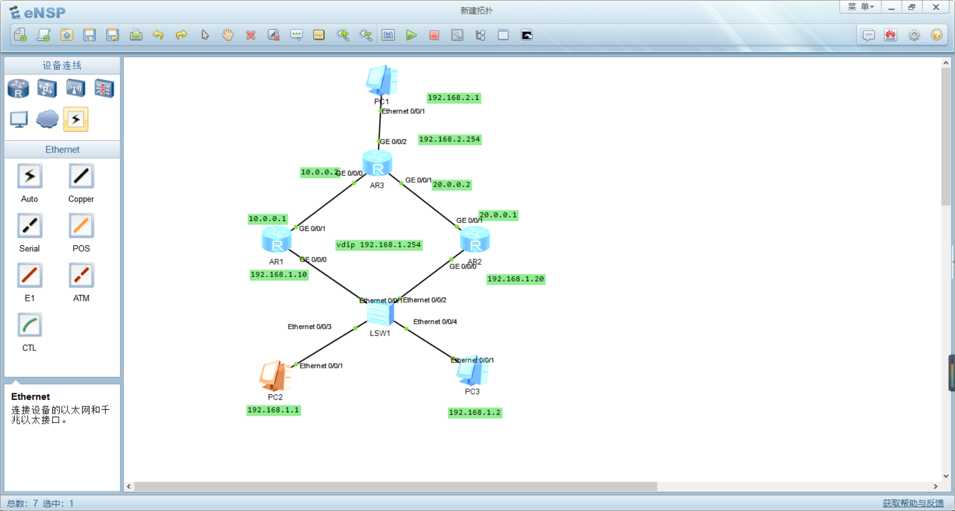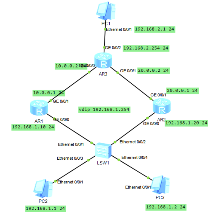 PC2、PC3通过交换机sw1连接路由器R3。为了提高可靠性,增加两台路由器R1、R2作为双出口连接R3,在双网关的情况下,如果在PC 上配置R1 或R2 的真实IP 地址作为网关,当其中一台路由器故障时,就需要手动更改PC 的网关IP,会带来一定时间的断网,造成数据丢失等影响。为了能够使故障所造成的断网影响达到最小化,增强网络的可靠性,网络管理员在R1 与R2 之间部署VRRP 协议,这样当任一网关发生故障时就能自动切换。这里在R3后连接一台PC,用PC2、PC3来连接PC1进行测试