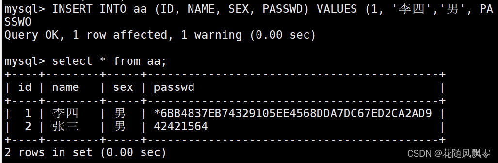 INSERT INTO class1 (id, name, passwd) values (1, '李四', PASSWORD('123456'));