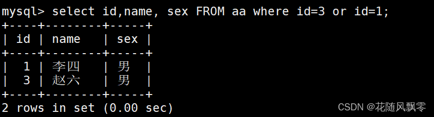 select id,name,sex from class1 where id=1 or id=2; #查询id为1或id为2的数据记录