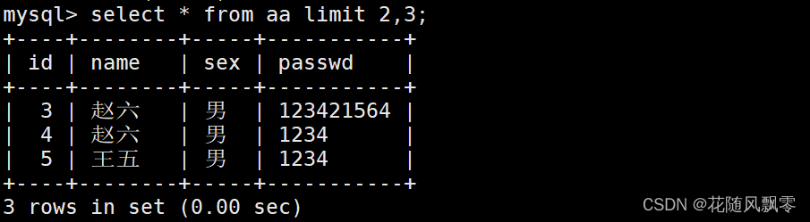 select * from 表名 limit 2,3; #显示第2行后的前3行(即显示第3~5行)