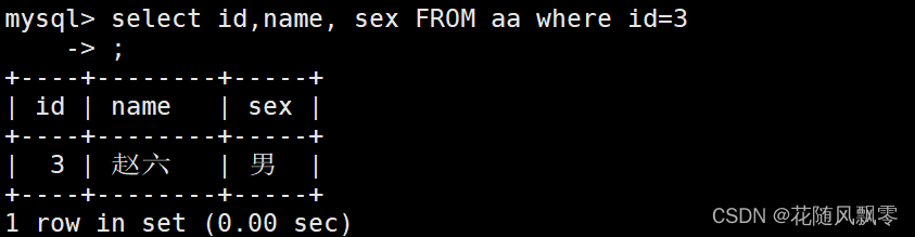 SELECT id, name, sex FROM class1 WHERE id=2; #查看id为2的数据记录,显示id、name、sex三个字段