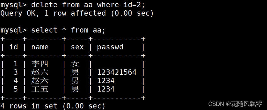 DELETE FROM aa WHERE id=2; #删除id字段值为2的数据记录
