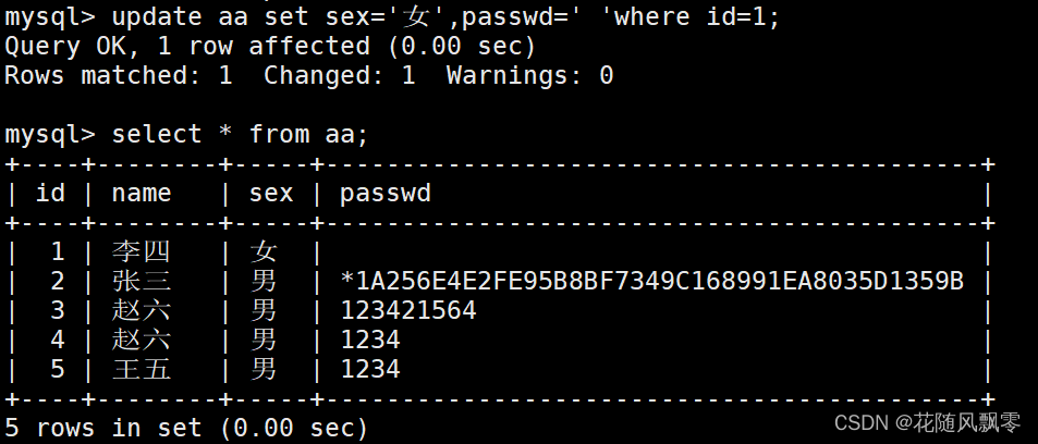 UPDATE aa SET sex='女',passwd=' ' WHERE id=1;