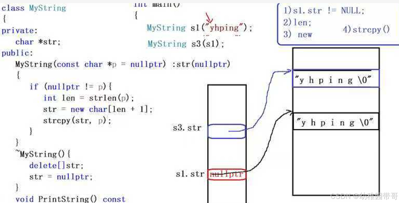 如果上述代码不采用深拷贝,会导致两个对象指向同一个堆区new出来的空间,在析构时会引发问题。