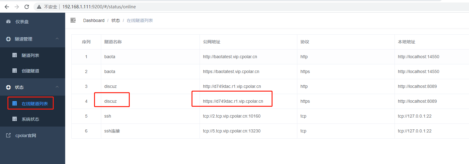 隧道更新成功后,点击左侧仪表盘的状态——在线隧道列表,可以看到DiscuzTest隧道的公网地址,已经更新为二级子域名了,将公网地址复制下来。
