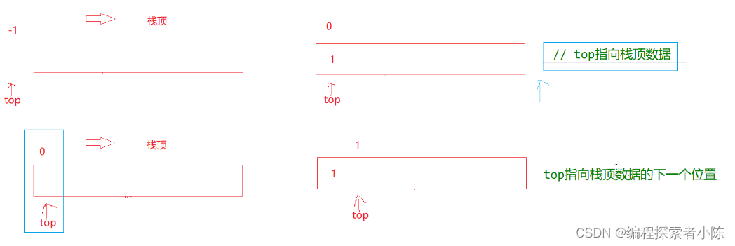 注意:top等于-1的时候top指向栈顶,top等于0的时候top指向栈顶的下一个位置,大家可以根据自己的情况选择。