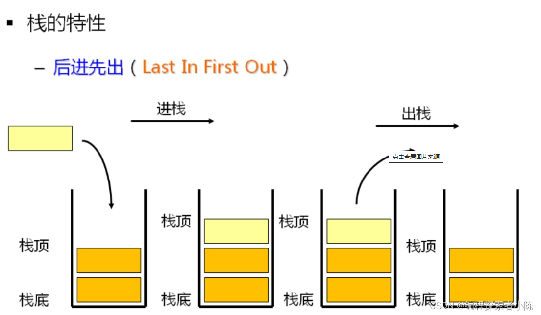 栈:一种特殊的线性表,其只允许在固定的一端进行插入和删除元素操作。进行数据插入和删除操作的一端 称为栈顶,另一端称为栈底。栈中的数据元素遵守后进先出LIFO(Last In First Out)的原则。