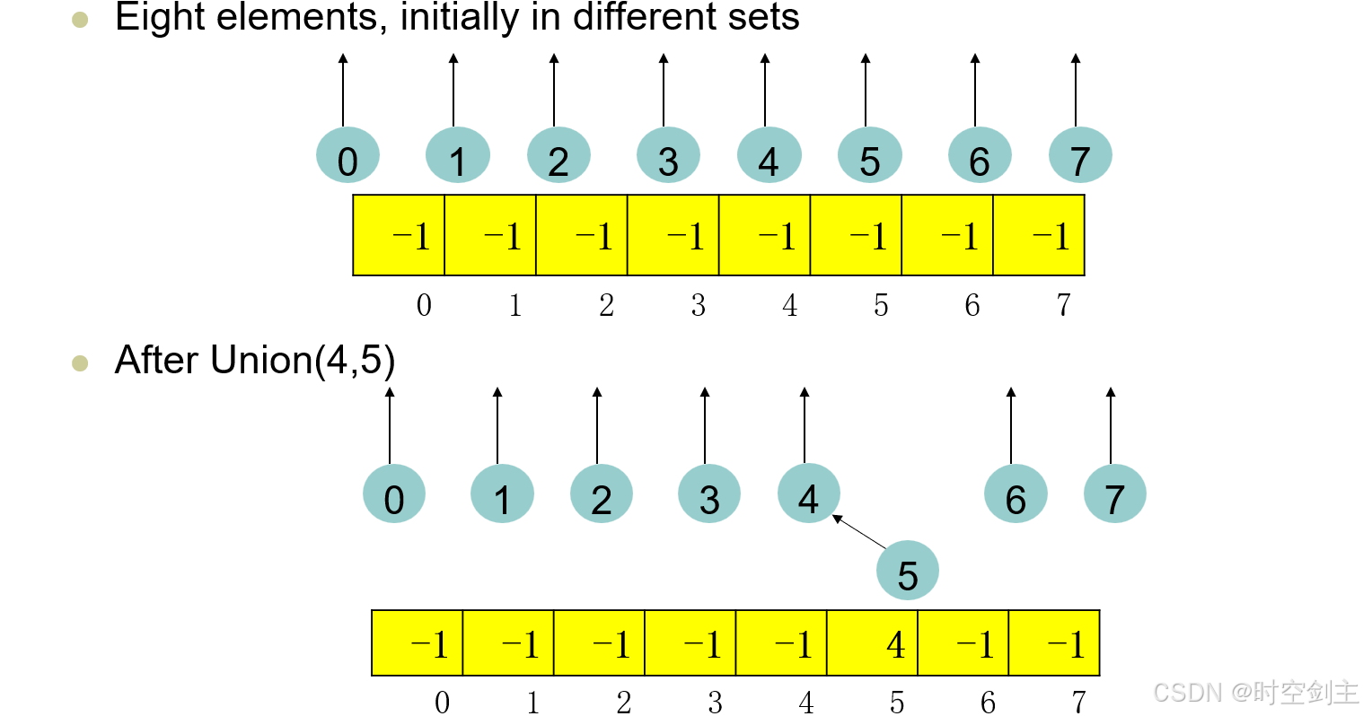 这样表示每一个节点都是单独的。它所在的集合不存在代表元,即它就是该集合的代表元。这也是find操作的递归边界。
